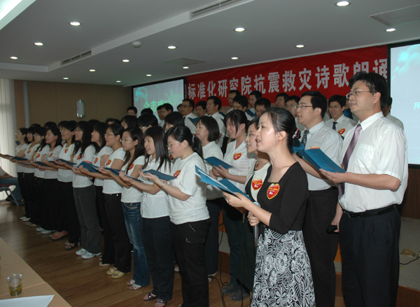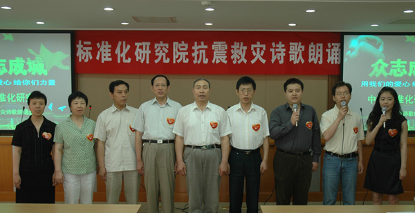 根据党中央、国务院大力宣传、学习、表彰抗震救灾中涌现出来的英雄模范和感人事迹的指示,我院纪委于2008年6月20日上午,组织召开了“中国标准化研究院抗震救灾诗歌朗诵会”,此次活动得到院党委、工会、共青团的鼎力支持,18个党总支、党支部都十分重视,认真组织、精心设计、积极的参与了活动。此次朗诵会荟萃了新近创作的一批不可多得的抗震救灾优秀诗歌,其中有很多支部自己创作了作品。通过朗诵的形式表达了我院职工对灾区人民的深情祈祷,对战斗在抗震救灾第一线人们的无比敬意,用朗诵的力量把灾难中展现出来的伟大民族精神再次加以升华,从多角度展示中华民族在大自然的劫难面前所迸发出的顽强生命力与民族凝聚力。激发了全院职工以实际行动支持参与抗震救灾和支援四川人民重建家园的工作热情与坚强决心。
