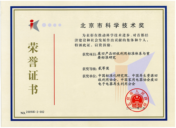 我院 “废旧产品回收利用标准体系与重要标准研究”项目获得北京市科学技术二等奖 时间:2011-05-03部门:办公室、资源与环境分院