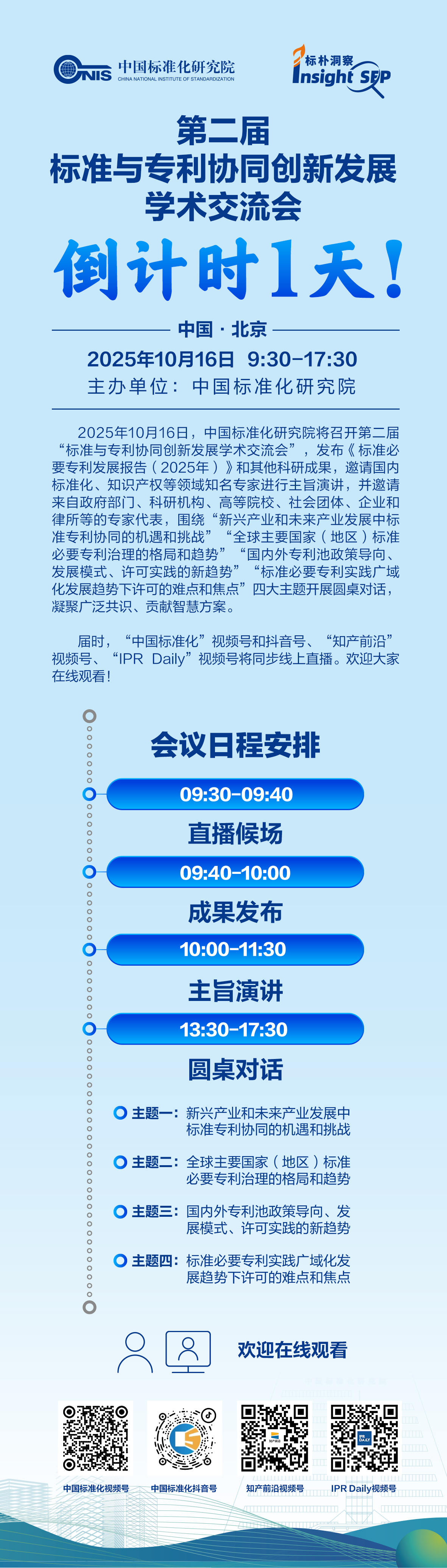 第二届标准与专利协同创新发展学术交流会倒计时1天!