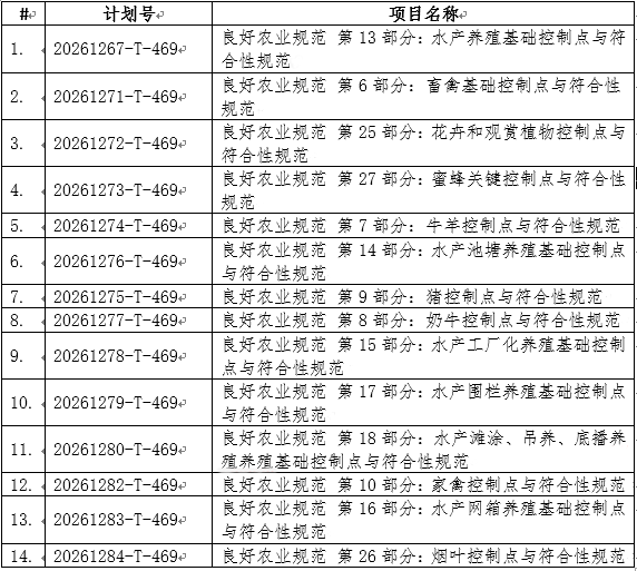 根据国家标准化管理委员会立项计划,由全国农业基础与通用标准化工作组(SWG 38)提出并归口管理的良好农业规范GB/T 20014系列国家标准修订任务已批准立项。为广泛吸收各相关方参与,现面向社会公开征集该国家标准的起草单位和起草专家,有关事项通知如下: