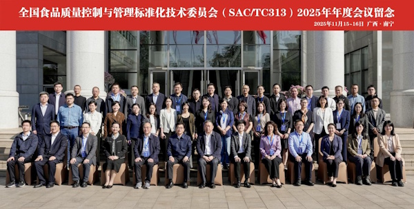 2025年11月15日-16日,全国食品质量控制与管理标准化技术委员会(SAC/TC313)2025年年度会议在广西壮族自治区南宁市顺利召开。标委会主任委员马纯良,广西壮族自治区市场监管局党组成员、副局长、一级巡视员黄震,市场监管总局食品生产经营司监管三处处长曹鑫,中国标准化研究院农业食品所副所长李强,标委会副主任委员中国农业大学食品学院院长廖小军,市场监管总局发展研究中心副主任陈云华及50余位委员出席会议。会议由标委会主任委员马纯良主持,黄震、曹鑫、李强分别致辞。