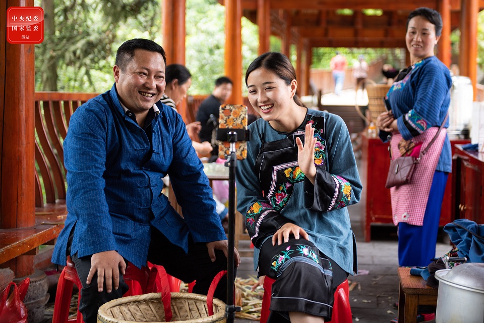 自精准扶贫工作开展以来,湖南省花垣县双龙镇十八洞村从一个贫困的小山村,成为全国文明村、全国乡村旅游示范村、省级脱贫攻坚示范村,在2016年实现了整村脱贫摘帽,2019年全村人均纯收入由2013年的1668元上升到了14668元。图为十八洞村第三任驻村扶贫工作队队长麻辉煌(左)与返乡大学生施林娇一起通过网络直播推销土特产。新华社发(陈思汗 摄)